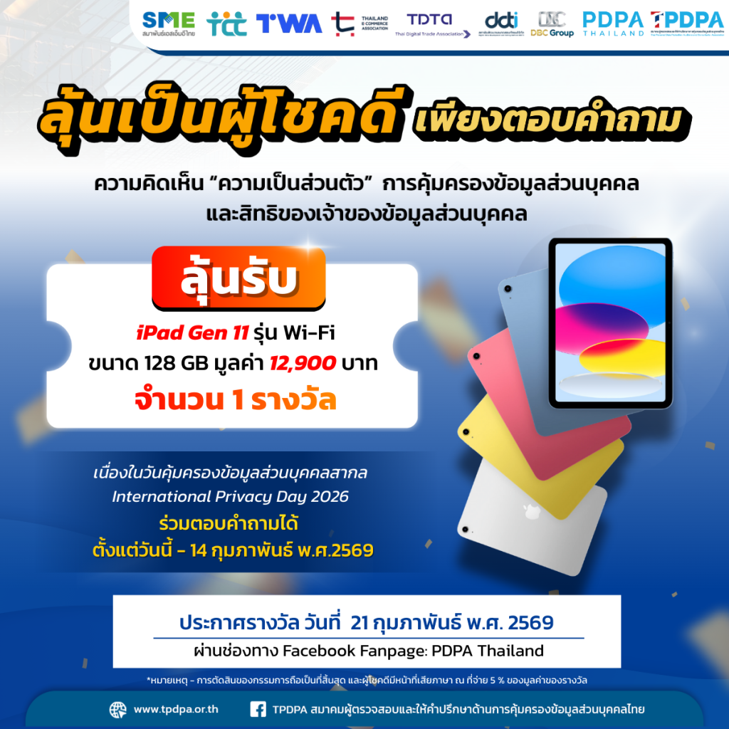 แบบสอบถามความคิดเห็นเกี่ยวกับ “ความเป็นส่วนตัว การคุ้มครองข้อมูลส่วนบุคคล และสิทธิของเจ้าของข้อมูลส่วนบุคคล”20/01/2026/in ข่าว เนื่องในโอกาสวันที่ 28 มกราคมของทุกปี กำหนดให้เป็นวันInternational Data Privacy Dayในปี 2569 นี้ ทาง PDPA Thailand และสถาบันพัฒนาและทดสอบทักษะดิจิทัล (DDTI) ภายใต้การบริหารงานโดย บริษัท ดีบีซี กรุ๊ป จำกัด (DBC Group) และพันธมิตร ได้แก่ สมาพันธ์เอสเอ็มอีไทย (SME Thai), สมาคมผู้ประกอบการพาณิชย์อิเล็กทรอนิกส์ไทย, สมาคมผู้ดูแลเว็บไซต์และสื่อออนไลน์ไทย, สมาคมการค้าดิจิทัลไทย, สมาคมผู้ตรวจสอบและให้คำปรึกษาการคุ้มครองข้อมูลส่วนบุคคลไทย (TPDPA) และสภาองค์กรของผู้บริโภค ได้ร่วมกันจัดทำแบบสอบถามเพื่อสำรวจเรื่อง “ความเป็นส่วนตัว, การคุ้มครองข้อมูลส่วนบุคคล และสิทธิของเจ้าของข้อมูลส่วนบุคคล” ขึ้น ระหว่างวันนี้ – 14 กุมภาพันธ์ พ.ศ.2569 ผ่านช่องทางการสื่อสารออนไลน์ไปยังประชาชนกลุ่มต่างๆ ซึ่งท่านสามารถติดตามผลการสำรวจได้ที่ www.tpdpa.or.th และ www.pdpathailand.com ท่านสามารถศึกษาประกาศความเป็นส่วนตัวได้ที่ https://pdpathailand.com/privacy-notice-questionnaires/ สำหรับท่านที่ตอบแบบสอบถาม และทำตามกติกา – เงื่อนไขครบตามที่กำหนด ลุ้นรับฟรี! iPad 11″ Wi-Fi ขนาด 128 GB จำนวน 1 รางวัล มูลค่า 12,900 บาท พิเศษ ขึ้นไปอีกขั้นเพียงแชร์โพสต์กิจกรรมตอบแบบสอบถามเป็นสาธารณะ พร้อมติดแฮชแท็ก #TPDPA และแนบหลักฐานที่ใต้โพสต์ ลุ้นรับเพิ่ม Samsung Galaxy A07 ความจุ 128 GB จำนวน 1 รางวัล (มูลค่า 3,990 บาท) ร่วมกิจกรรมตอบแบบสอบถาม คลิก Post Views: 7,186 https://tpdpa.or.th/wp-content/uploads/2026/01/กิจกรรมลุ้นรับรางวัล.png 1200 1200 Pichitchai Sangnak https://tpdpa.or.th/wp-content/uploads/2024/01/TPDPA-01-300x149.png Pichitchai Sangnak2026-01-20 18:37:412026-01-21 09:33:43แบบสอบถามความคิดเห็นเกี่ยวกับ “ความเป็นส่วนตัว การคุ้มครองข้อมูลส่วนบุคคล และสิทธิของเจ้าของข้อมูลส่วนบุคคล”